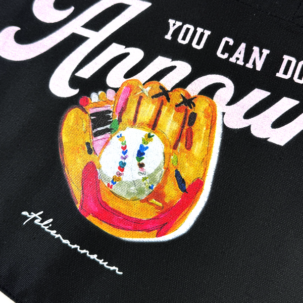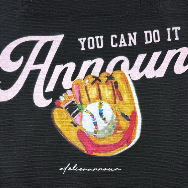 横長でA4サイズが入る形状で、厚みもしっかりしているスクエアバッグ。フロントにベースボールモチーフをプリントしたアイテムになります。